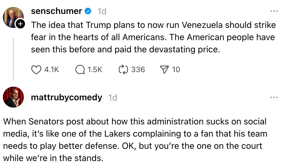 🛢️ Oil companies keep getting the US military to do their labor and then reap the profits. So imagine this: Trump nationalizes the American oil companies (or at least one of ‘em) and then taxpayers could actually get the money from all the Venezuelan oil we’re about to steal. He could claim the mantle of “affordability” and steal Zohran’s brand of populism – all while rebranding “socialism” as “patriotism.” This could be the ultimate heel turn!