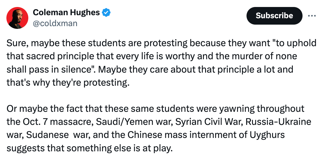 But also, Iâm a Jew. And my spidey sense tells me anti-Zionist anger frequently comes with a chaser of Jew-hate. Columbia students chanting âGlobalize the Intifadaâ and âFrom the River to the Seaâ en masse may not completely understand what theyâre implying â but it sure doesnât sound like a rejection of violent brutality, the thing they purport to oppose. I hate the safetyism that dominates society nowadaysâŚbut also, Iâd just like to feel slightly more confident weâre not witnessing some sorta precursor to Kristallnacht 2.0.
